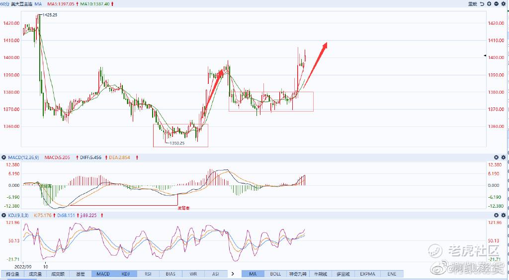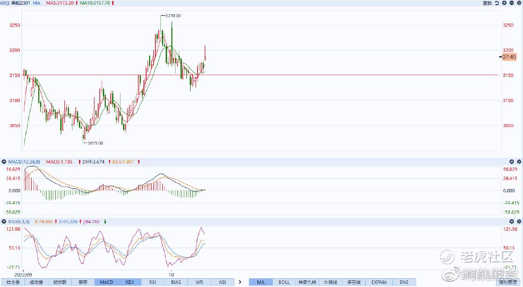 菜粕主力合约早间开盘小幅高开,主要原因在于昨日后半夜美豆上涨,昨日无论是文章还是直播都给大家强调菜粕可以做多了,目前进了多单的持续盈利,初步目标3200已经达成注意减仓。先来看看小时线美豆走势,昨日晚间美国10月USDA报告一出,利好美豆,美豆上涨动能增加,直接走出上涨趋势,盘面来看,美豆底部支撑结构形态较好,目前已经走出较好上涨趋势;日线级别,美豆MACD金叉已经形成,美豆技术面看涨对国内双粕来说是非常利好的消息。