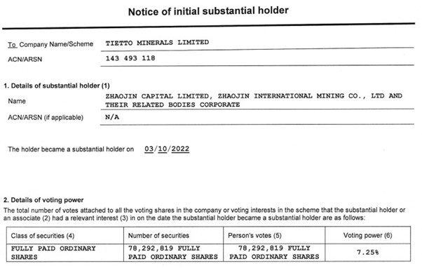 招金矿业自今年3月以来不断在二级市场增持Tietto的股份,根据TIE提交的最新股东变更文件显示,截止10月3日,招金持有TIE 7800万股普通股,占比7.25%。赤金国际于上个月投资TIE 4900万澳元,增发后持有8500万股普通股,占比约8%。