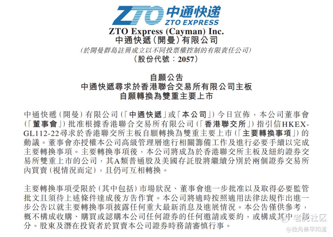 11月18日,中通快递公告,公司寻求香港联交所主板及纽约证券交易所双重上市。2016年,中通快递在纽约证券交易所正式挂牌上市,2020年于港交所二次上市。$中通快递(ZTO)$ $中通快递-SW(02057)$
