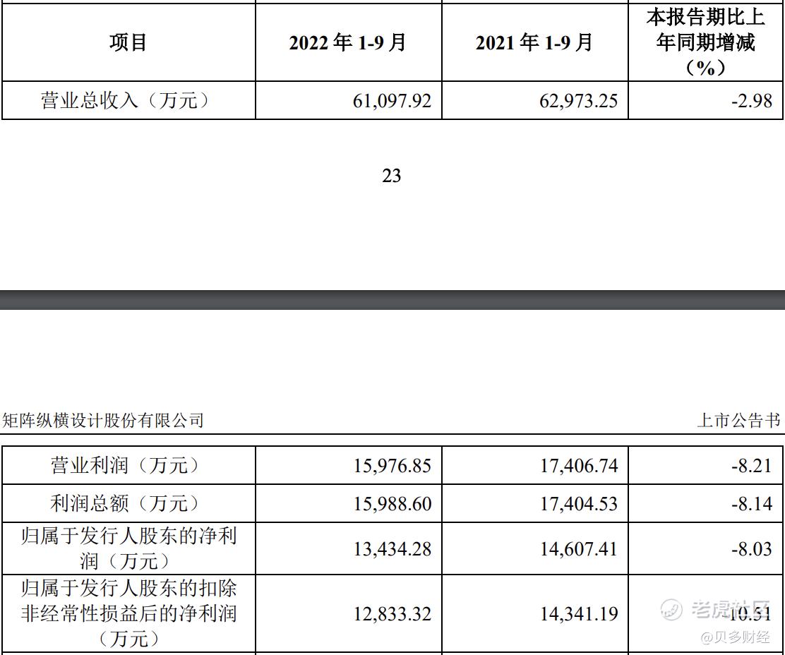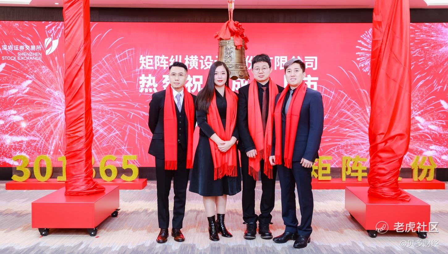11月22日,矩阵纵横设计股份有限公司(下称“矩阵股份”,SZ:301365)$矩阵股份(301365)$ 在深圳证券交易所创业板上市。本次上市,矩阵股份的发行价为34.72元/股,发行数量为3000万股,募资总额约为10.42亿元,募资净额约为9.48亿元。