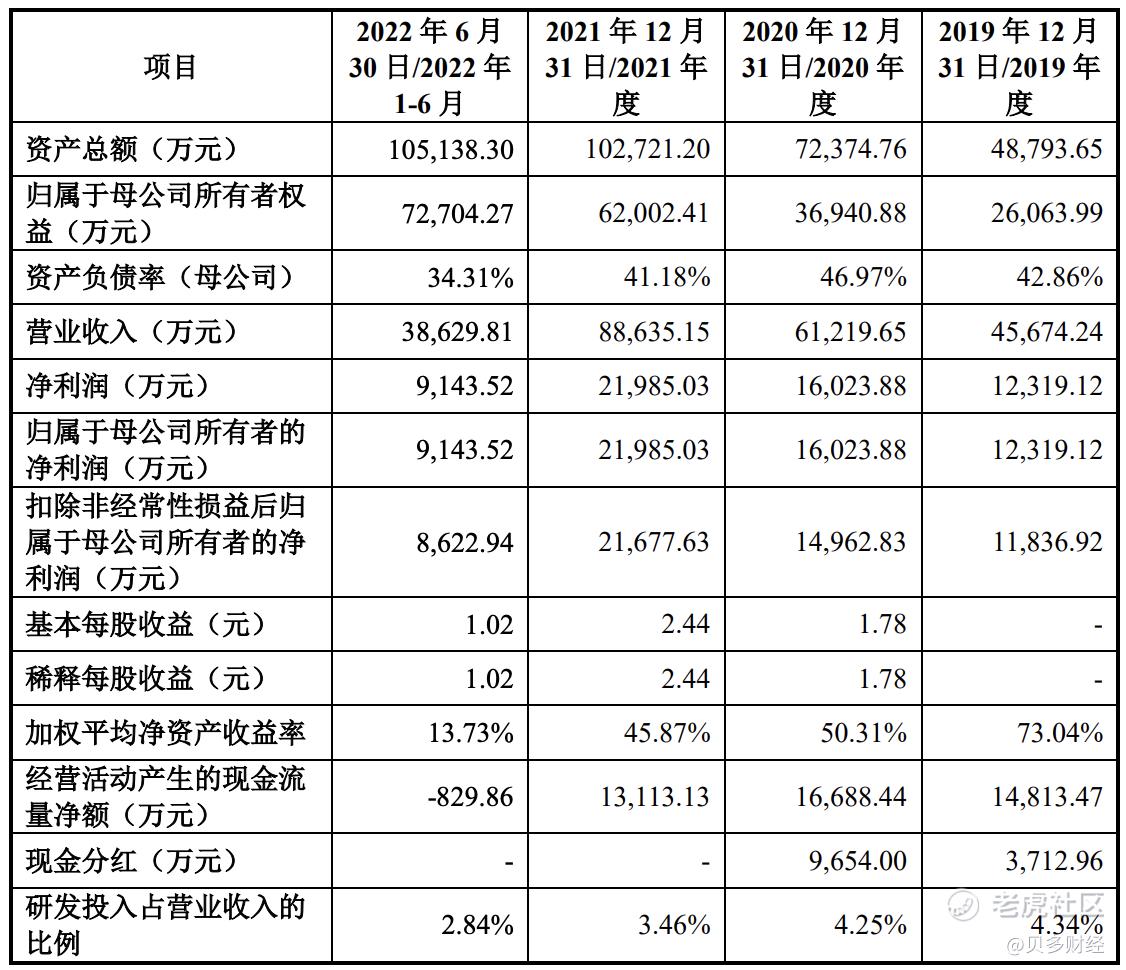 2019年、2020年、2021年和2022年上半年,矩阵股份的收入分别为4.57亿元、6.12亿元、8.86亿元和3.86亿元;净利润分别为1.23亿元、1.60亿元、2.20亿元和9143.52万元;扣非后净利润分别为1.18亿元、1.50亿元、2.17亿元和8622.94万元。
