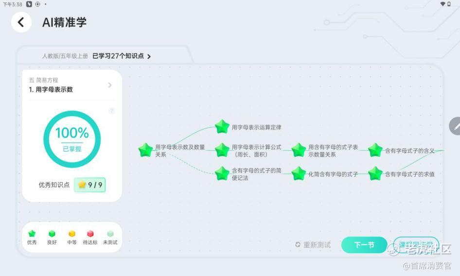 鉴于一年级的课程过于简单,我特意找来了一位五年级的小朋友来做测试。选择他刚刚学过的课程《用字母表示数》,先来做一组小节测试。测试完成后,自动生成了一个学情报告,上面清晰地标注了学生对知识的掌握程度,对知识点的分解也十分细致。