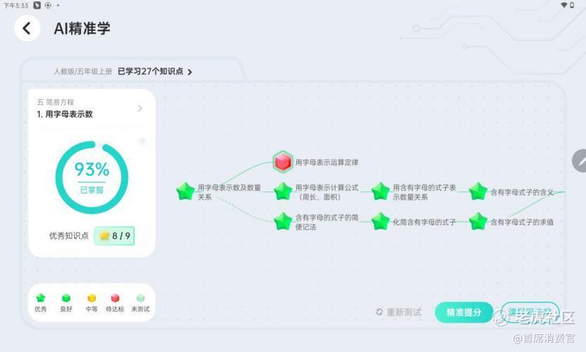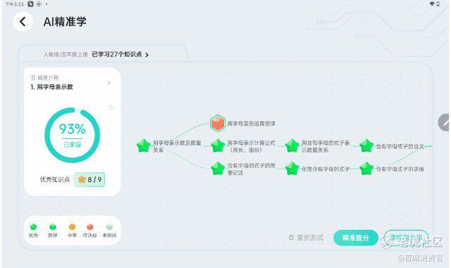 通过学情报告,孩子可以知道自己对这节课的掌握程度仅为93%,其中《用字母表示运算定律》这个知识点掌握较差。那么,如何提升孩子的成绩呢?