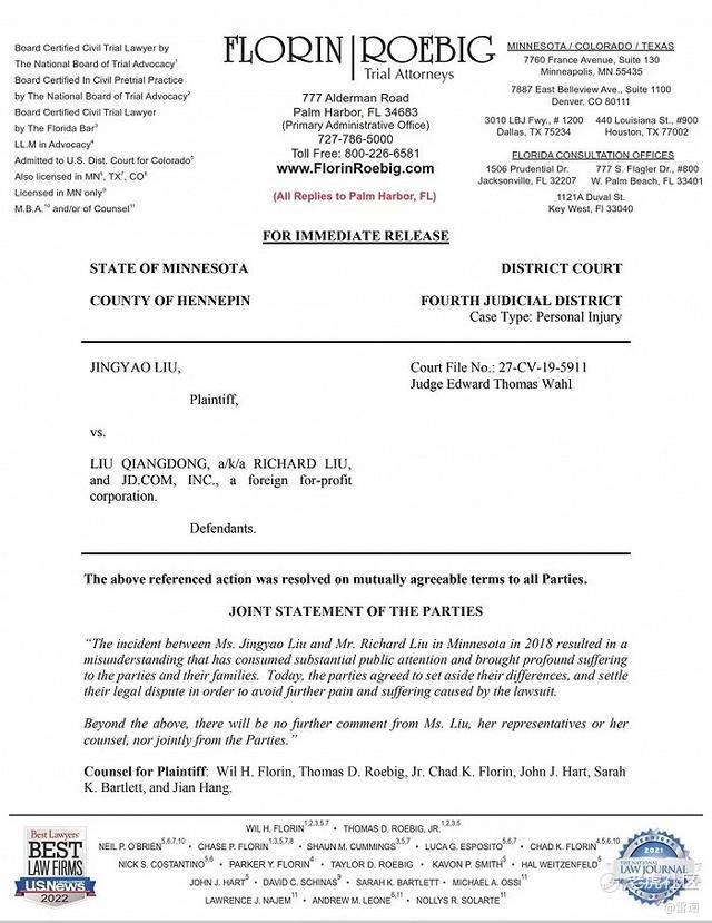 北美时间10月1日晚间,双方律师团队发表联合声明,声明称刘强东和刘婧尧女士于2018年在美国明尼苏达的一次偶然事件所造成的误会,占用了大量的社会资源,也给彼此的家庭造成了深重的困扰。