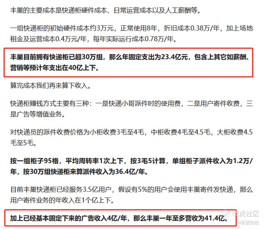 之前曾有数据表示:丰巢的主要成本包括快递柜硬件成本、日常运营成本以及人工薪酬等,每年大概在40亿上下;而丰巢的赚钱方式主要有快递小哥派件时的使用费、用户寄件收费以及广告等增值业务,每年营收能达到41亿多。
