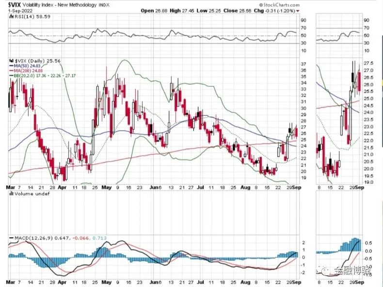 VIX跳空高开,却上不去(连周一周二的高点都达不到,27.5就阻挡了上涨),最后,收阴收跌。