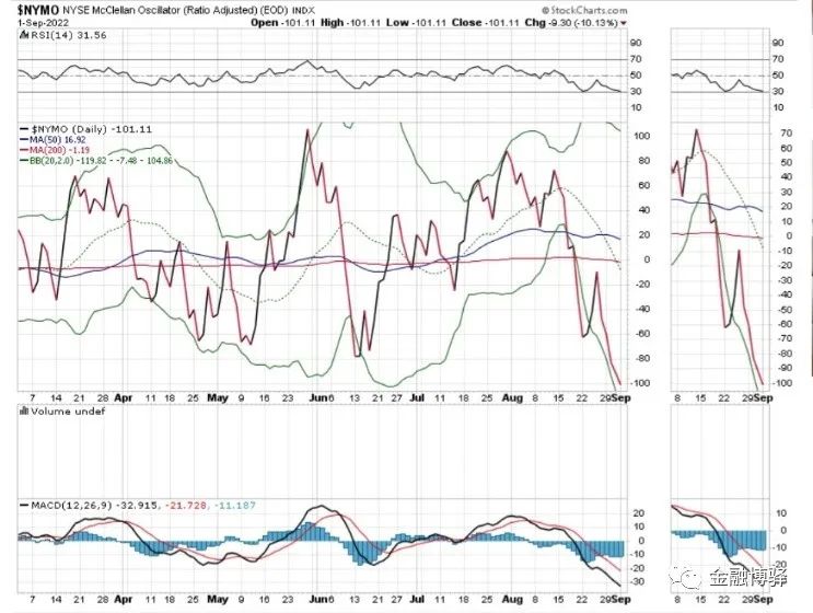 NYMO继续跌,深入极值区。读数下-100,是2020年3月以来最低。NYMO是中值回归性极强的指数,接下来的反弹应该力道不小。