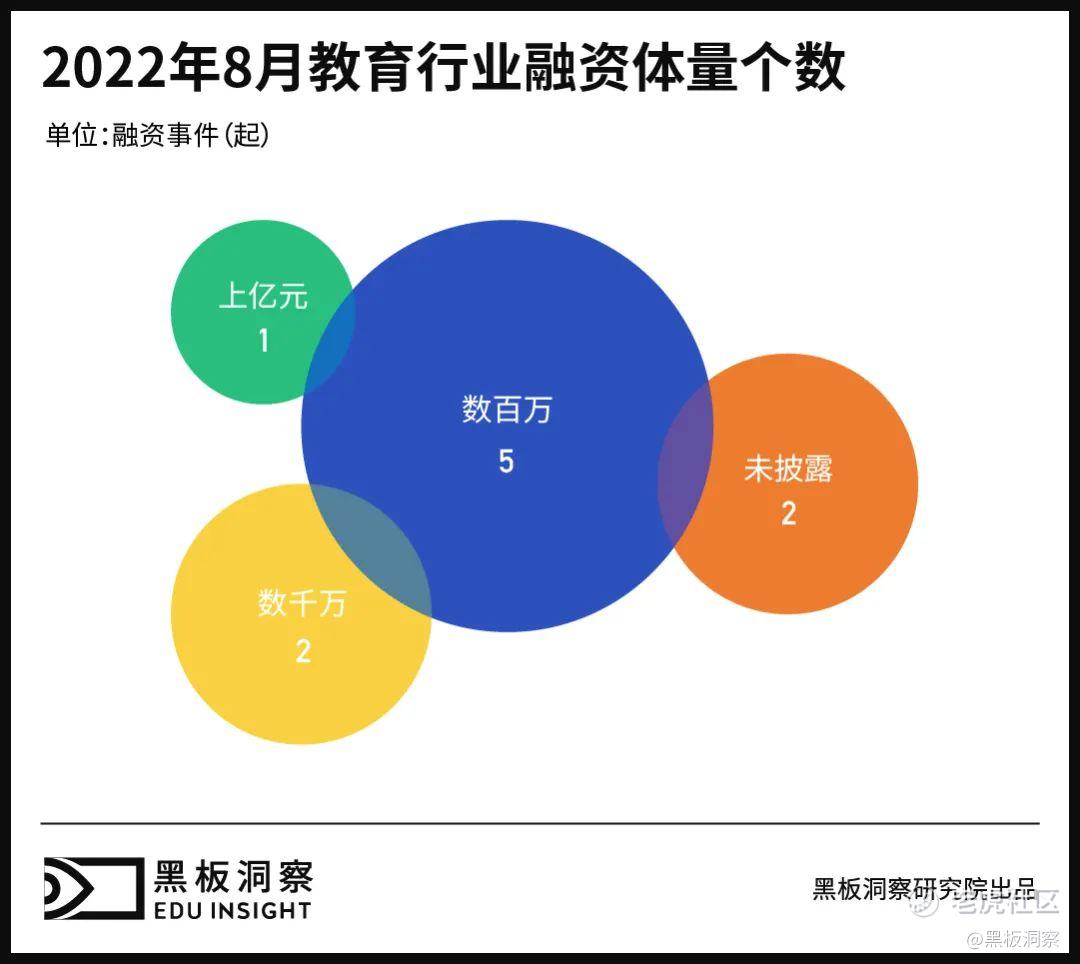 2022 年 8 月教育行业共发生了 10 起融资事件,共融资约 2.56 亿元,其中最大数额的融资金额有 2500 万美元,为见知教育赴美 IPO 上市。与去年同期相比,融资总金额减少 75.27%,融资事件数量同比减少 56.52%。与上月相比,融资总金额减少 82.05%,融资事件数同比增加 11.11%。教育行业半数融资与职业教育有关。