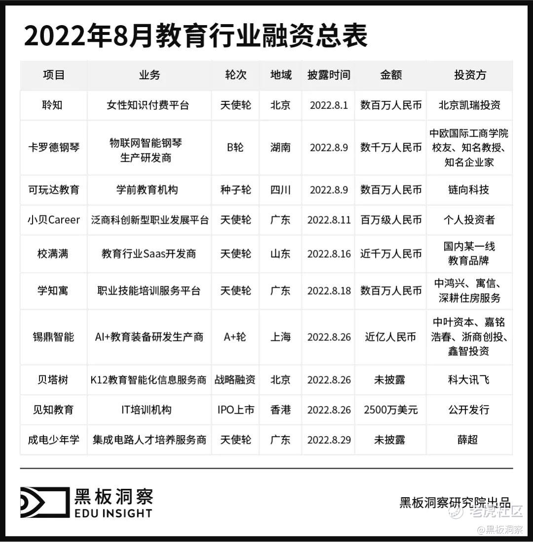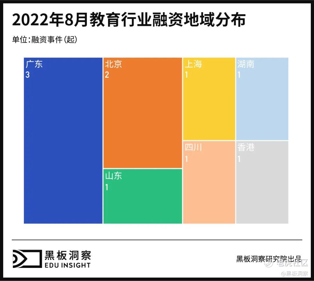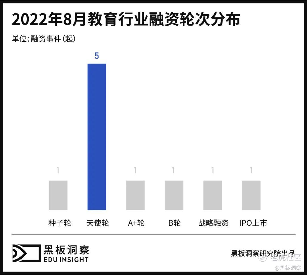 总体而言,8 月融资再度减少,回归 7 月前的低迷境况,在融资事件数小有增加的情况下,融资总金额大幅减少 82.05%,基本与 6 月融资总体情况持平。其中,仅见知教育 IPO 上市一起事件就为本月融资总金额贡献了约 6 成的份额。