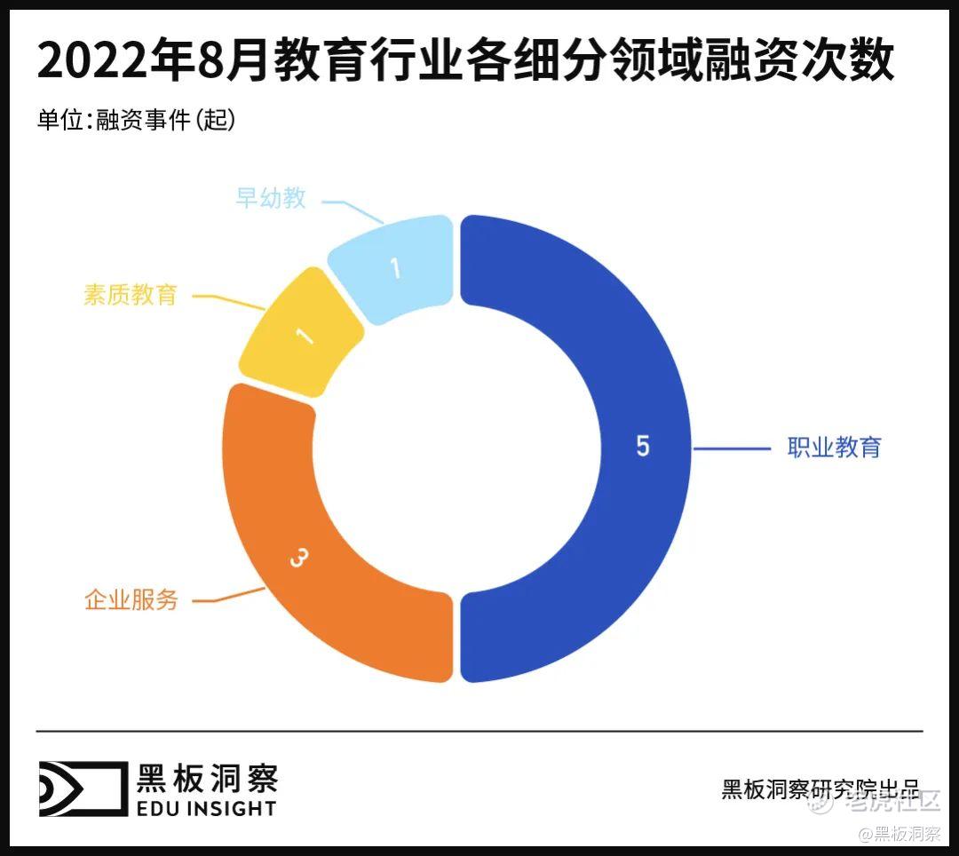 8 月融资事件细分领域中,职业教育融资数量为 5 起,居于细分领域榜首。企业服务领域融资数量为 3 起;早幼教和素质教育领域各发生 1 起融资事件。值得注意的是,聆知于今年 3 月转型为女性知识付费平台。