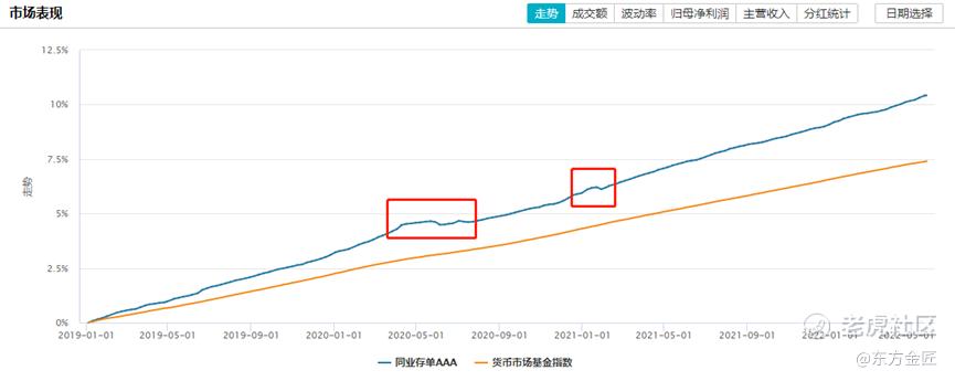 最近三年,货币市场基金指数表现弱于同业存单AAA指数,不过从指数走势上可以看出,同业存单是有回撤的,就是说是有亏损的可能性的。而货基几乎0回撤。