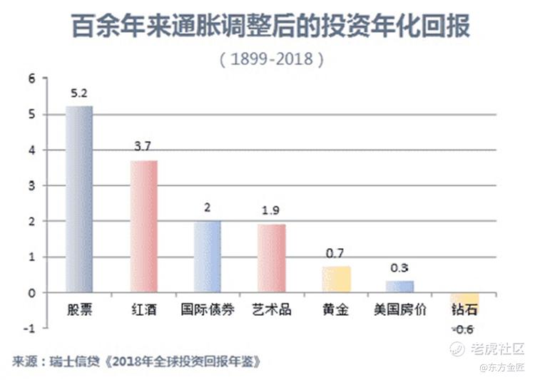 我们知道当钱越来越多,股市会跟着水涨船高。历史经验告诉我们,股票是最好的抗通胀资产。瑞士信贷统计了近100年各类资产剔除通胀影响后的实际回报率,股票最高,有5.2%的回报,而黄金只有0.7%。