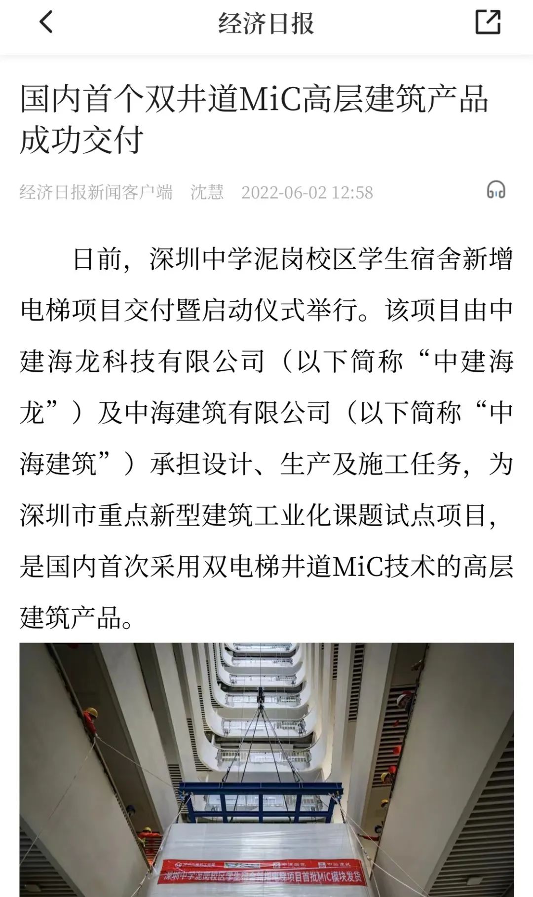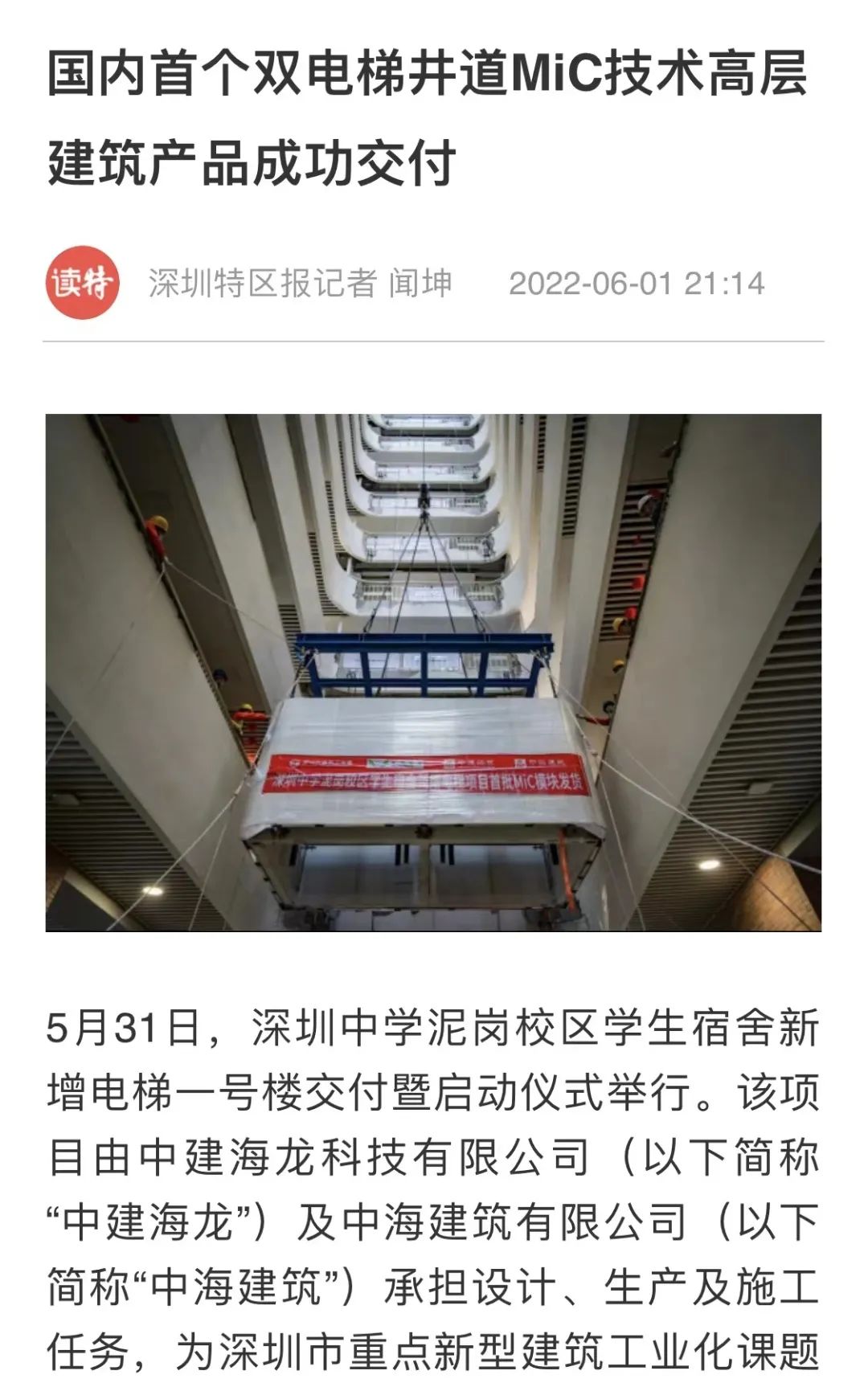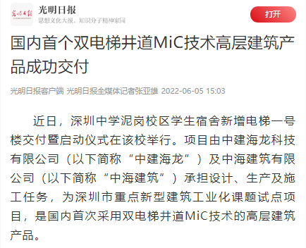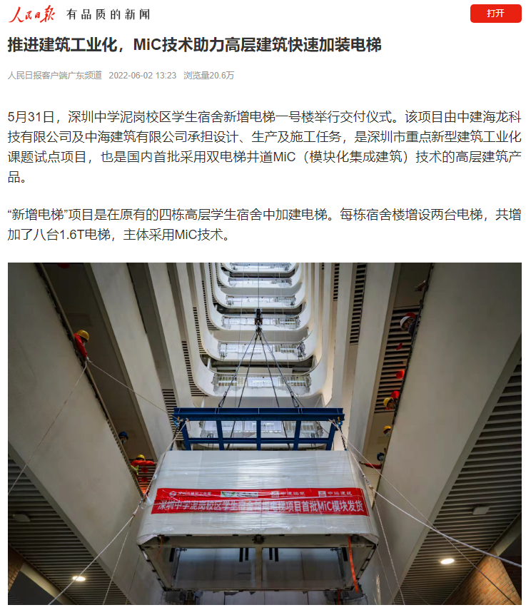 近日,人民日报、光明日报等多家媒体对中建海龙积极推动国家建筑工业化进程,落地深圳市重点新型建筑工业化课题试点——深圳中学新增电梯项目进行了全方位解读与报道。今天,为您分享《国内首个双电梯井道MiC技术高层建筑产品成功交付》。