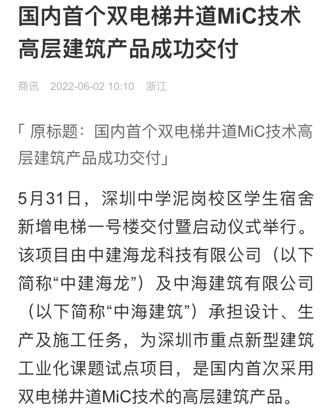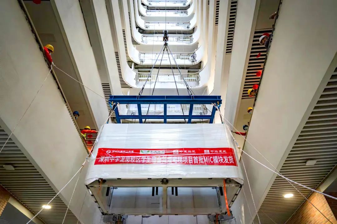 5月31日,深圳中学(泥岗校区)学生宿舍新增电梯一号楼举行交付仪式。该项目由中国建筑国际旗下中建海龙及中海建筑有限公司(以下简称“中海建筑”)承担设计、生产及施工任务,是深圳市重点新型建筑工业化课题试点项目,也是国内首批采用双电梯井道MiC(模块化集成建筑)技术的高层建筑产品。