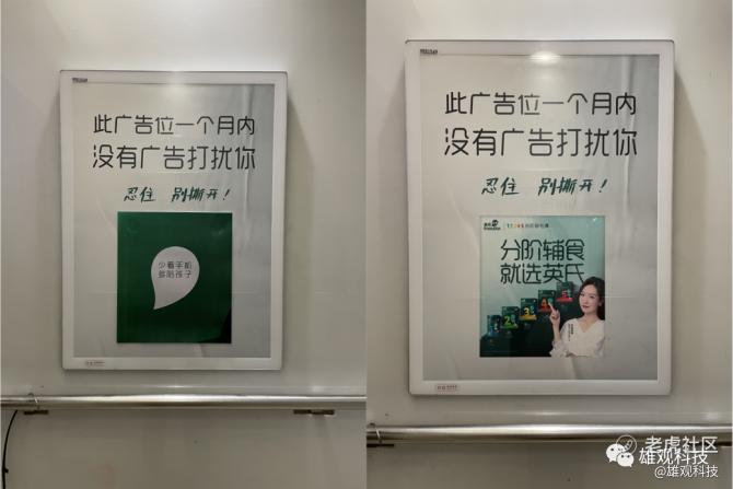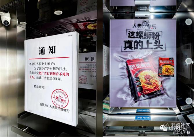 当然,案例不止如此。人类快乐螺蛳粉联合分众电梯媒体,在广告牌上贴出一则“通知”。内容大致意思是,为了减少广告对业主/住户的打扰,品牌方决定将广告打到用户们看不到的上头,因此广告位关闭1周。而当用户抬头时,就能看到人类快乐螺蛳粉的创意广告。这不仅在电梯间掀起了一股嗦粉热潮,也让人类快乐螺蛳粉这个新锐品牌走向了大众主流人群,品牌势能得到大幅提升。