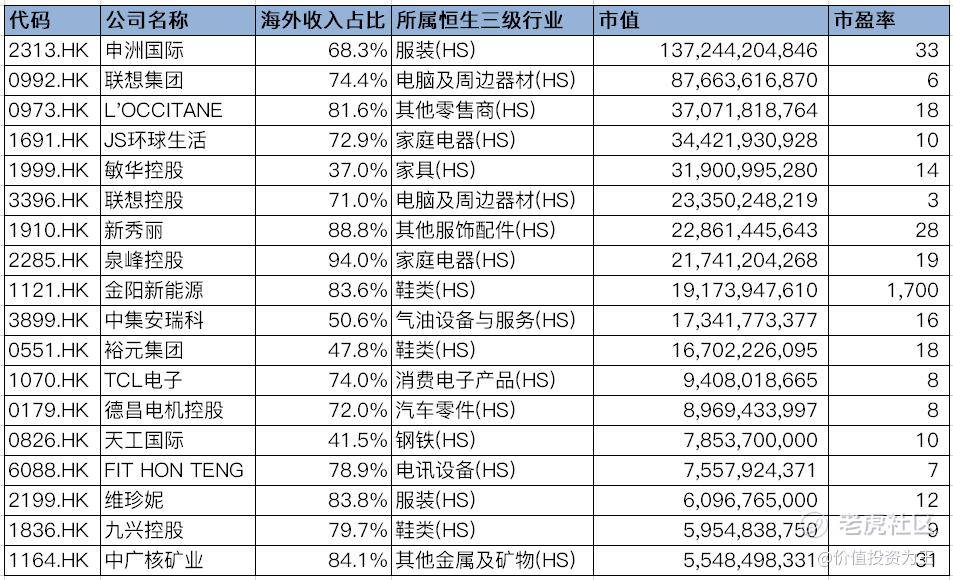 从港股来看,结合以上行业梳理了18家海外收入较高的公司,值得关注: