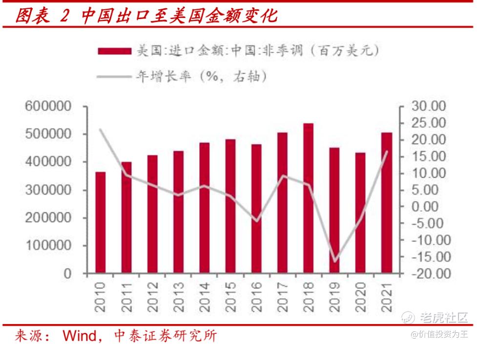 2018年贸易战后,2019年,我国出口美国的金额同比下滑超15%,在疫情肆虐助攻下,2021年的出口才恢复增长: