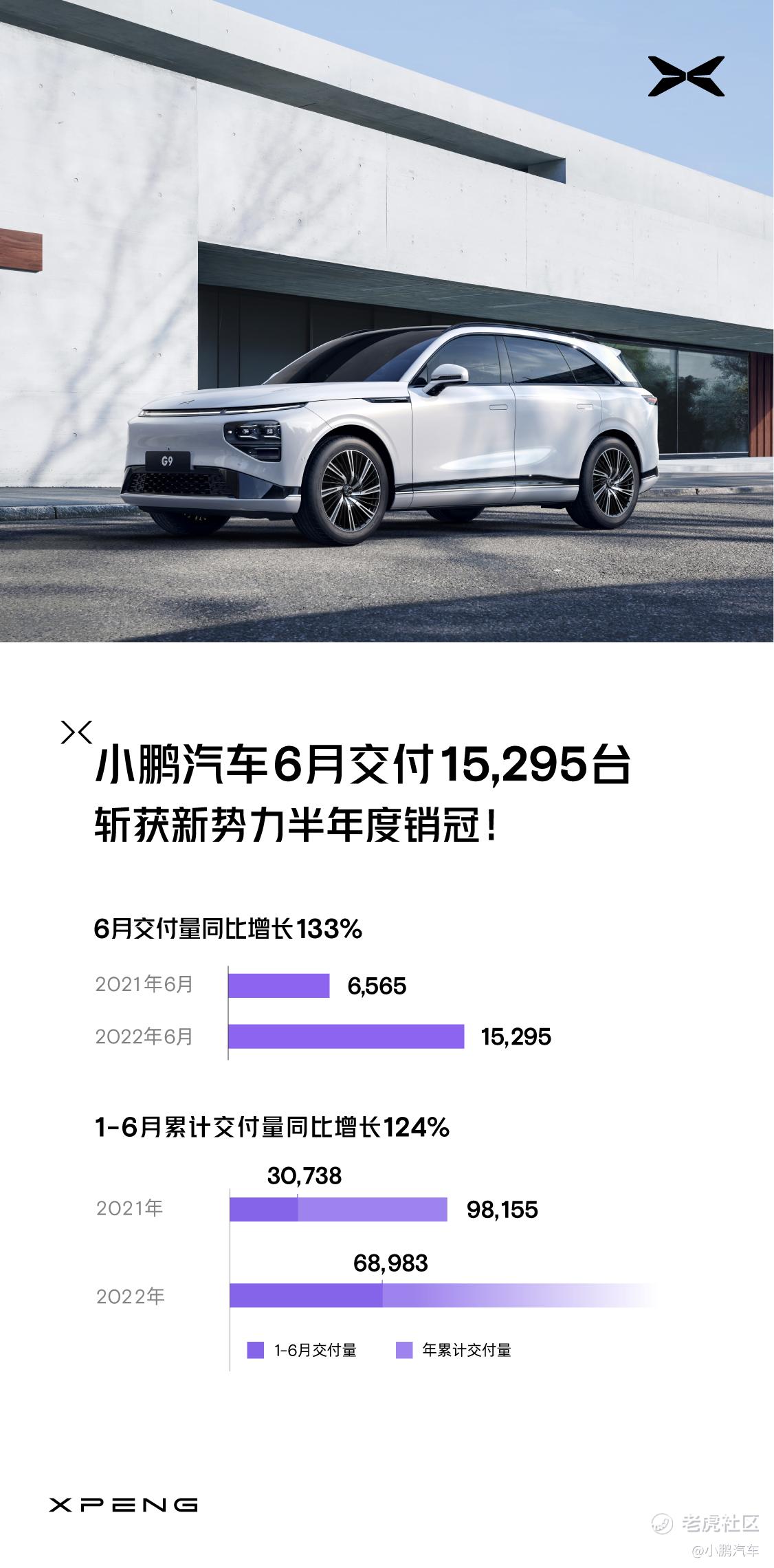 2022年6月总交付15,295台,同比增长133%。其中,小鹏P7交付8,045台,小鹏P5交付5,598台,小鹏G3系列交付1,652台。