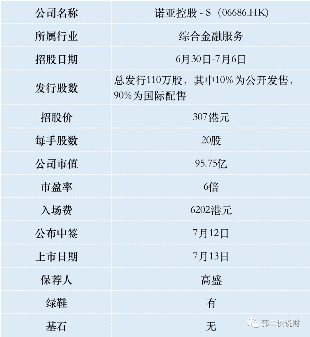 诺亚控股2010年11月已经在美国纽交所挂牌上市,此次来港二次上市发售价格最高将不超过307港元/股,每两张美股存托凭证(ADS)对应一张港股普通股。