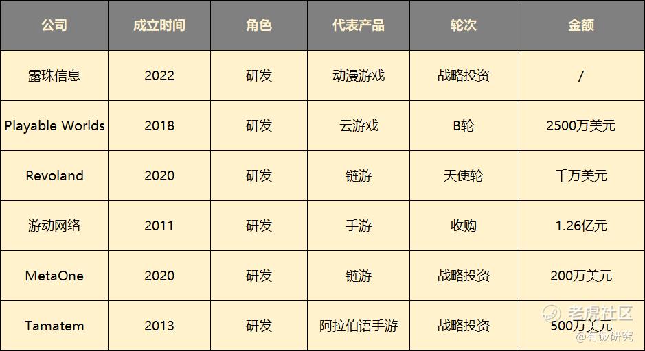 在这10家公司中,研发商占6个,其中有两个做链游的,是Revoland和MetaOne,一个专门做阿拉伯语手游的Tamatem,一个搞云游戏的PlayableWorlds。