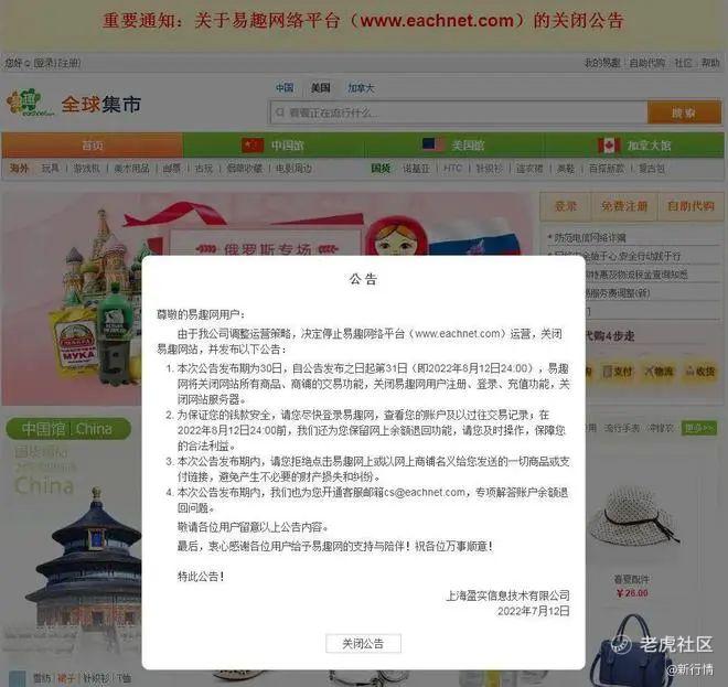 近日,上海盈实信息技术有限公司公告称, 由于公司调整运营策略,决定停止易趣网络平台运营,关闭易趣网站。
