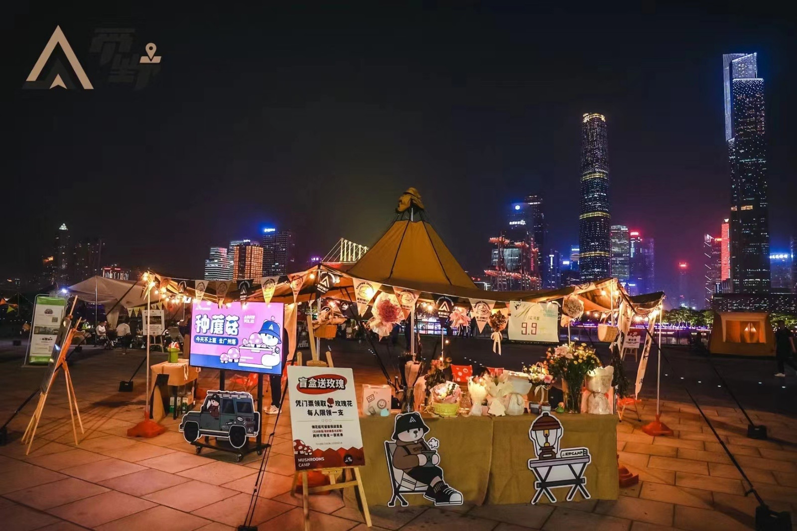 在觅野希望打造的露营版图里,用户能体会到的乐趣不只是坐在帐篷门口看看星空那么简单,当“飞盘”,“咖啡”等元素结合进来,露营便成为了连接各种休闲活动的中心场景。早年的户外音乐节便是音乐演出和露营的结合,这种“露营+”的模式,能为用户打开更大的想象空间,也能帮助行业做得更接地气。例如今年520期间,觅野开展了“今天不上班,来广州塔种蘑菇”快闪露营会,现场搭建了众多蘑菇风格的帐篷,结合了花艺、市集、电影等元素,让市民在繁华闹市体验露营。