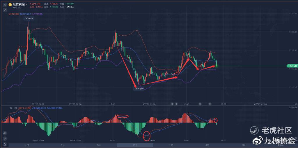 其次再看看上边,昨天22:45到昨天的最低1714时,就开始调整,布林带在今天凌晨2:30收口,又在8:30开口,实体是沿着布林带的上轨向上走的,随后现在还是布林带是缩口的状态,就算黄金今天还有明天在震荡大家也不要着急,因为周四有利率决议,还有GDP,PCE数据的公布,这些数据的公布都会给黄金带来一定的波动。