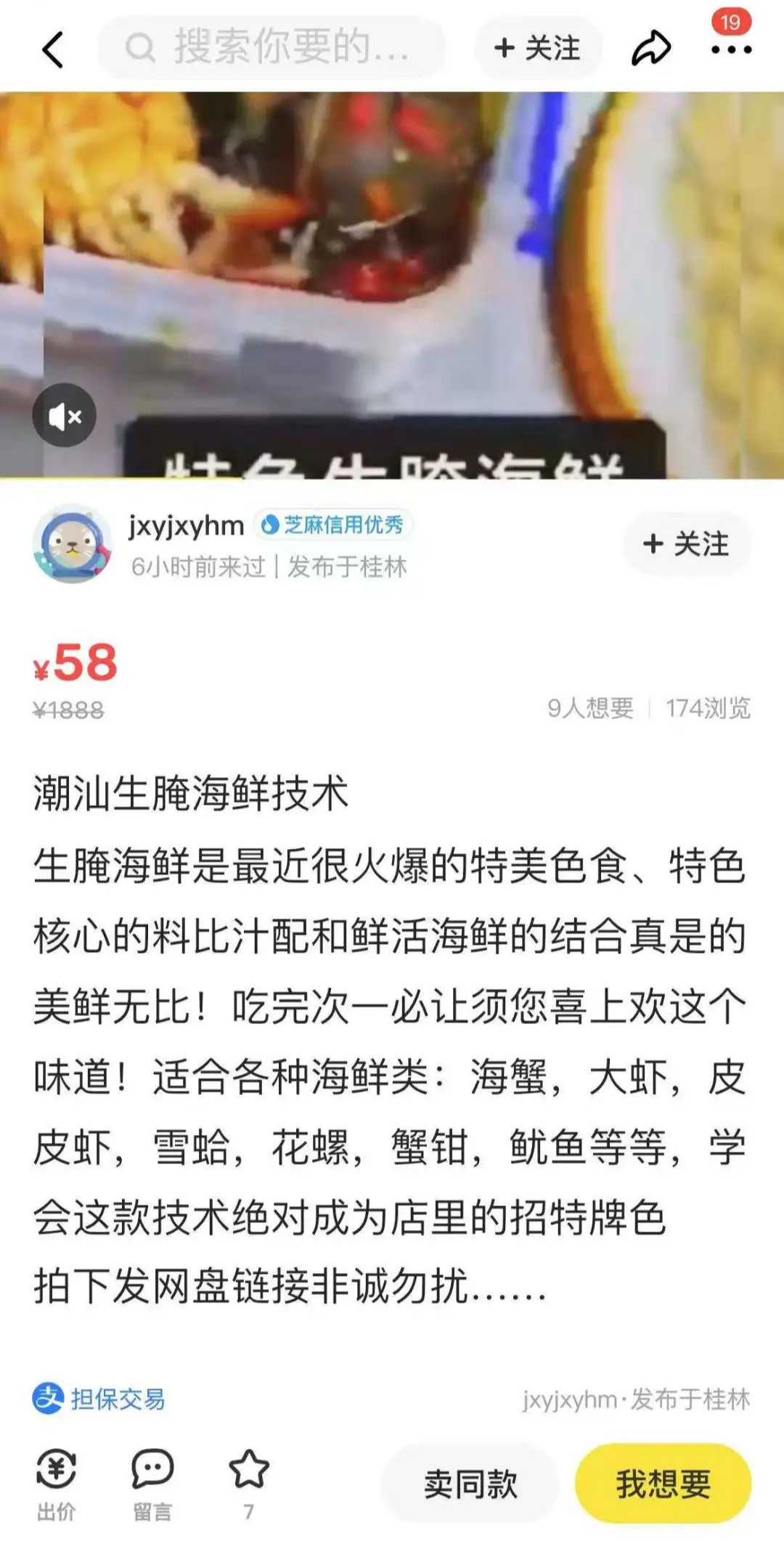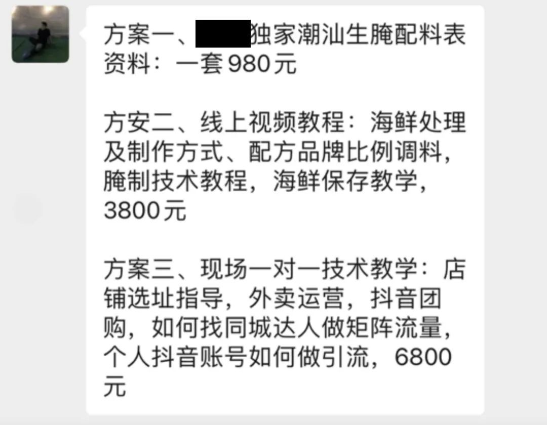 伸手党可以花钱给生意不错的店交学费。潮汕本地一家新开的生腌店一边在抖音宣传海鲜,一边做起了卖课的生意:配料表980、上网课3800、一对一教做抖音引流6800。