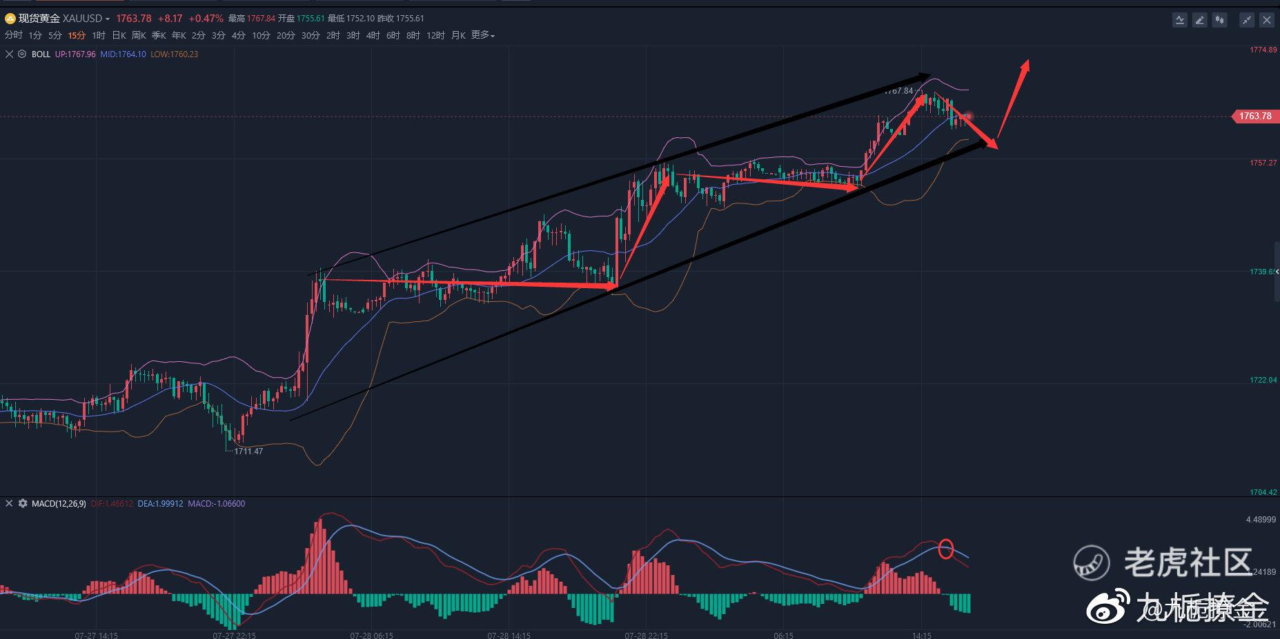 首先,看15分钟图,很显然,整体就是一个向上走的趋势,行情的波动也是比较大的,昨天凌晨鲍威尔的讲话,是出现了一波拉升,布林带也是在昨天凌晨开口,在昨天早上7点收口,但是实体也还是在向上走,在昨天晚上第二季度GDP公布时,又出现了一根大阳线,布林带在今天凌晨2点漱口,有在今天10:30开口,下午14:15又出现高点1767,现在布林带是打算收口了,实体也是出现了回调,已经从布林带的是哪个上轨回到了布林带的中轨了。