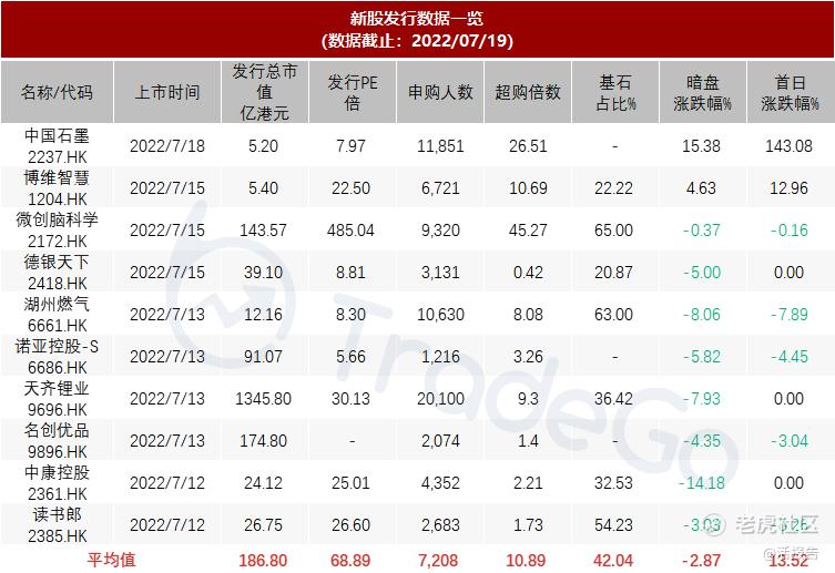 暗盘及首日收益率上,7月初,多家公司密集上市,其中涂鸦及智云健康无亮眼表现,润迈德及鲁商首日大跌,玄武云仅微涨,中旬近9家集中上市,其中仅博维智慧暗盘及首日表现尚可,中国石墨首日罕见暴涨143.08%,其余均涨跌不一,截至目前,暗盘涨跌均值约为-2.87%,而首日约为13.52%。