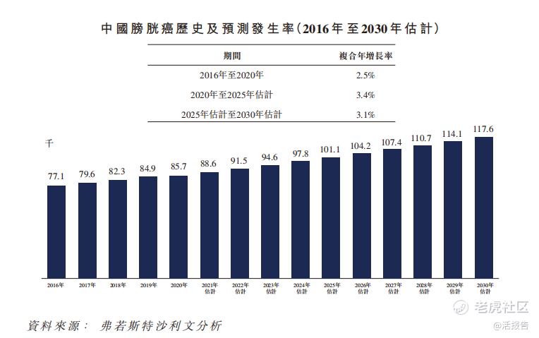 中国膀胱癌发生率由2016年的77,100人增加至2020年的85,700人,2016年至2020年的复合年增长率为2.5%。膀胱癌发生率预期将于2025年增长至101,100人,2020年至2025年的复合年增长率为3.4%,并于2030年进一步达117,600人,2025年至2030年的复合年增长率为3.1%。