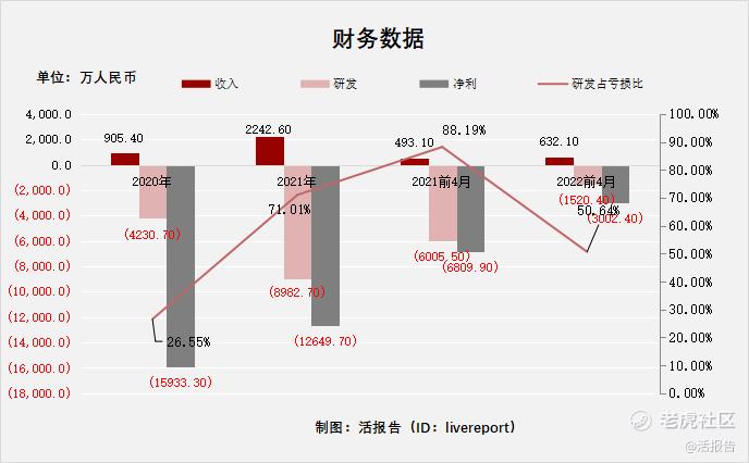 研发分别约为人民币-4230.7万元、-8982.7万元、-6005.5万元及-1520.4万元,2021年同比增长率为112.32%,2022前4月同比增长率为-74.68%;