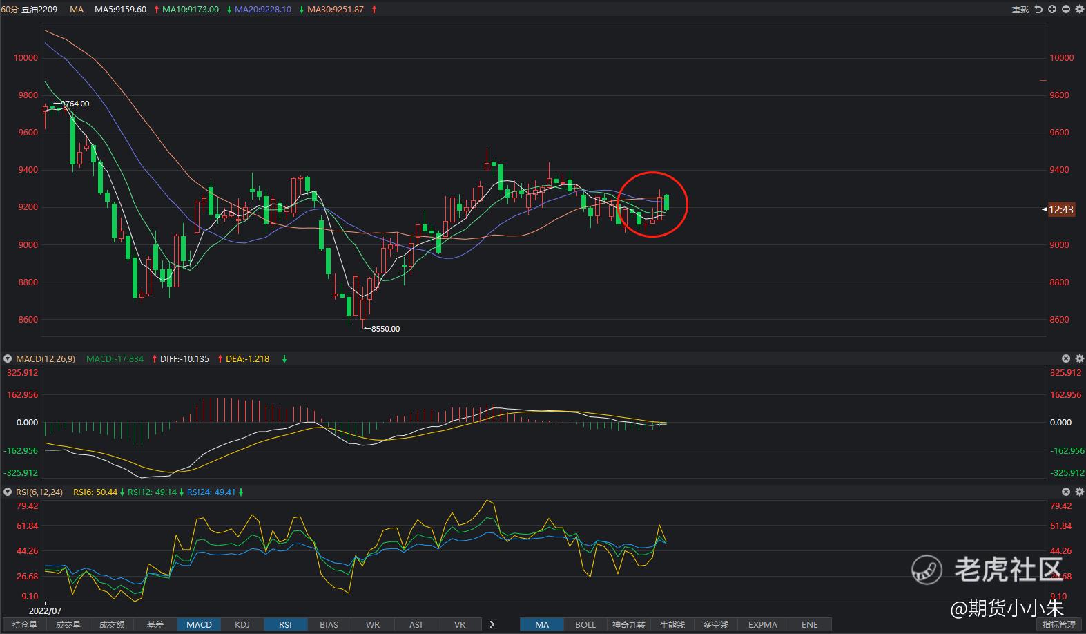 从小时线级别来看,豆油2209主力合约上周五尾盘拉升,影线上触9296后回落至30日均线9250附近收盘。今日早盘高开低走,现价9192,下影线试探5日与10日线的支撑力度。MACD指标在零轴附近黏合,具体走势尚不明显,RSI指标三线都在50附近,买卖双方势力均衡。