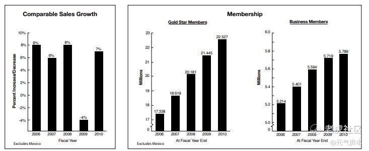 2006至2010年期间,可比销售额一直在拉动Costco的增长,且在2008年美国经济衰退的顶点也是如此,除了2009年(大衰退刚刚结束)可比销售额出现了小幅下调。Costco的会员数量在此时间段也一直在增长。
