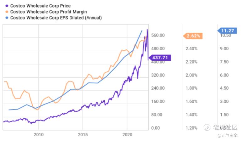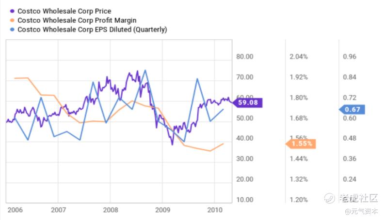 2006至2010年Costco股价、净利率、EPS走势(来源:SeekingAlpha,YCharts,下同)