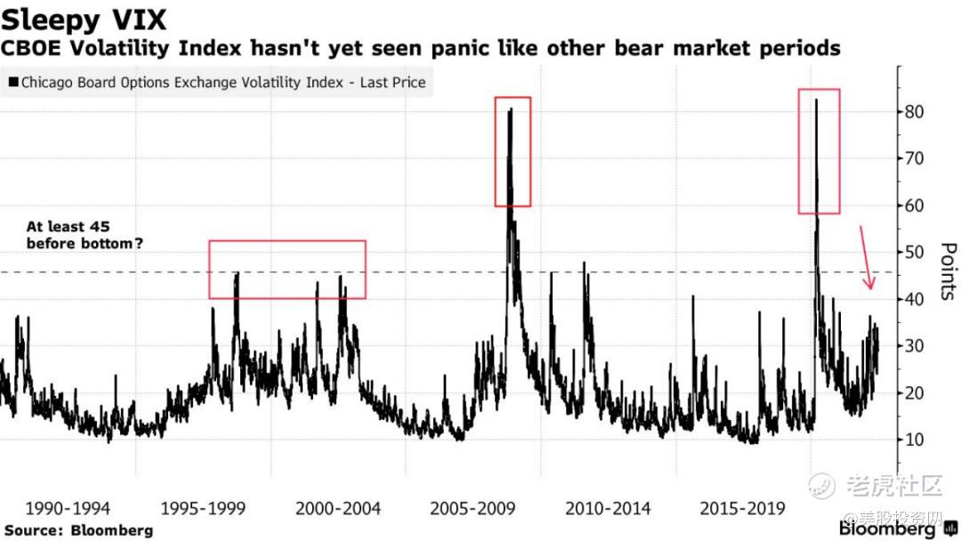 我们美股投资网调研发现尽管美股市场近期经历了暴跌,投资者却并未感到有多恐慌。芝加哥期权交易所波动率指数(VIX),即股票投资者情绪恐惧指数,目前远低于过去熊市的水平。$标普500波动率指数(VIX)$