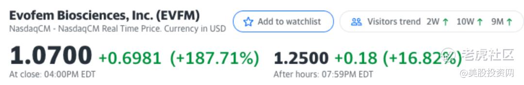 最近几天炒得沸沸扬扬的堕胎法案让美国新型避孕凝胶生产商$Evofem Biosciences Inc.(EVFM)$ 股价周一暴涨187.7%,在美国女性生育权利受挫之际,Evolfem 的避孕药 吸引了投资者的兴趣。股价两天大涨 240%,今天盘后上涨到 1.25美元。