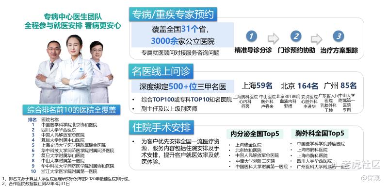 其次,在客户非常关心的就医环节,目前“家安芯”的门诊预约覆盖全国31个省,3000余家公立医院,全面覆盖综合排名前十的医院,深度绑定500多位国内三家专家视频问诊,全力为用户提供最专业、最优质的医疗服务。