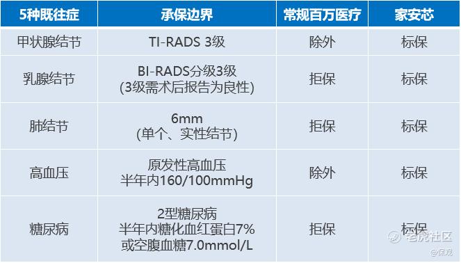 作为太保首款管理式医疗非标体健康险产品,“家安芯”别出心裁设计了四大投保计划来满足非标体客户中细分人群的投保需求,可覆盖原发性高血压、Ⅱ型糖尿病、甲状腺结节、乳腺结节和肺结节5大带病人群。包括TI-RADS 3级及以下的甲状腺结节、BI-RADS 2级及以下的乳腺结节、单个实性且小于等于6毫米的肺结节、原发性高血压(低于160/100 mmHg)和2型糖尿病(糖化血红蛋白小于等于7%或空腹血糖小于等于7.0mmol/L)都有机会承保。