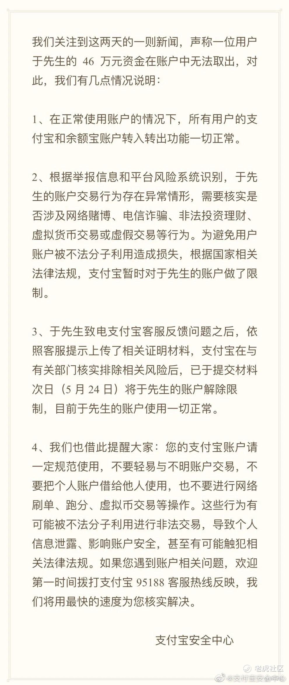 6月22日,支付宝安全中心回应表示,根据举报信息和平台风险系统识别,于先生的账户交易行为存在异常情形,可能涉及网络赌博、电信诈骗、非法投资理财或是虚假交易等违规情形。