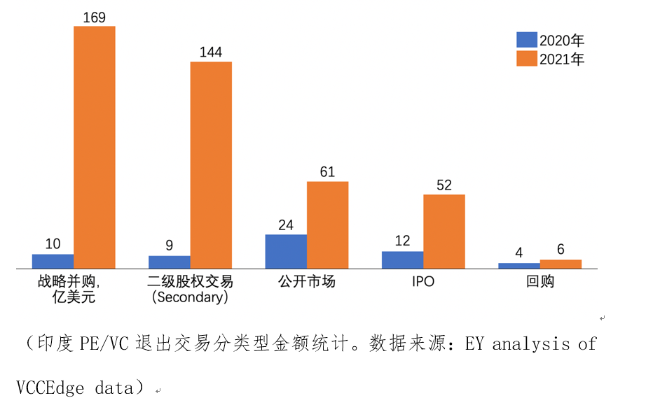 在涵摄范围更广的PE/VC退出市场,印度全国风险投资协会(IVCA)统计数据显示,2021年印度退出交易金额合计433亿美元,相当于2020年的7.3倍。这其中,通过战略并购退出的交易金额为169亿美元,相当于2020年的16.9倍,并且在所有退出方式中排名第一。而互联网行业依旧是战略并购的主力军,交易金额占比过半,在23次交易中录得87亿美元。