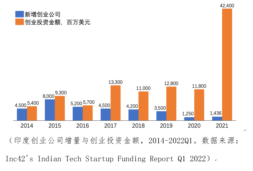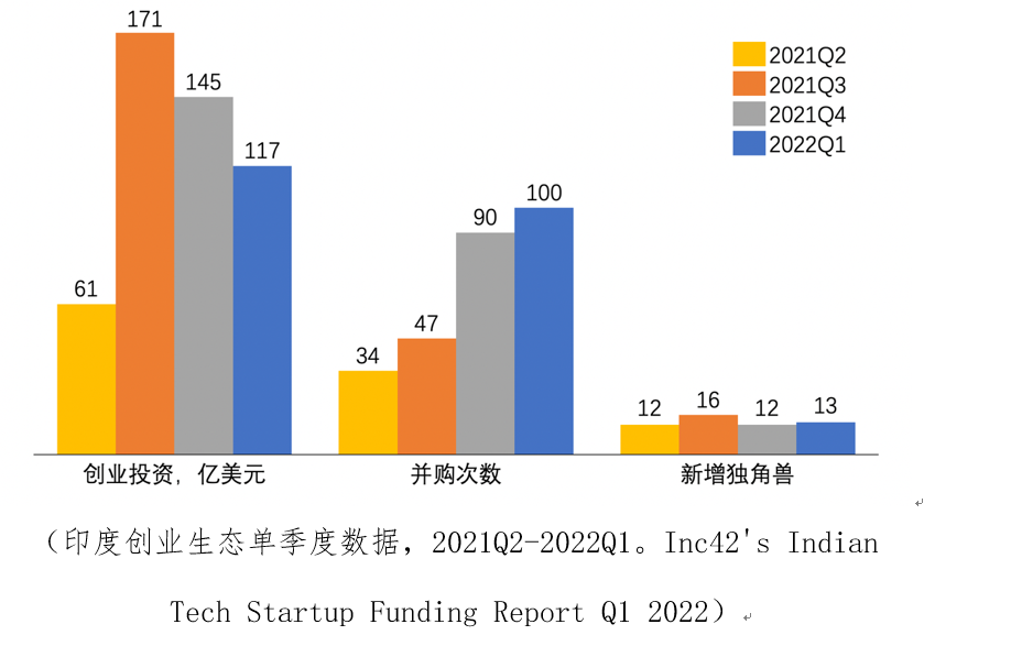 进入2022年第一季度,印度的创业生态继续高歌猛进。Inc42 Media数据显示,创业投资金额合计117亿美元,高于2021年单季度平均水平,100次并购交易创下印度单季度历史最高纪录,13家新增“独角兽”创下印度历年一季度历史最好成绩。