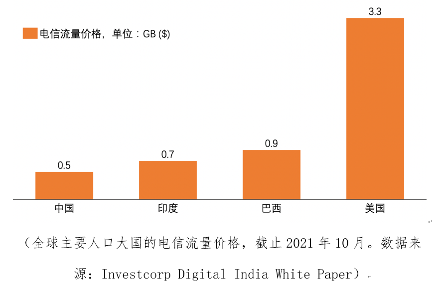 此外,新冠大流行还加速了印度社会的数字化进程,消费者越来越习惯于在本地生活平台购买食品,消费教育、影音、资讯、医疗保健等在线服务,通过在线交易市场购买股票抑或加密货币。“COVID-19已经使科技公司不再是一种选择,而是一种无处不在的现实。”全球投资管理公司Investcorp撰写的《数字印度白皮书》如是总结。政策环境同样至关重要。2015年,莫迪政府分别推出了“创业印度(Startup Initiative)”与“数字印度(Digital India)”两项宏观倡议,尽管直接投资不过数十亿美元,但其最核心的措施之一是在3G、4G频谱的招标中,继续依赖信实集团等印度头部私人资本,加剧了电信行业的市场化竞争烈度。Jio,即信实集团的全资电信公司,最早开始在印度提供最便宜的电信流量,曾经每天向人们免费提供2GB数据。这引发了一场价格战,印度的流量价格降至如今的0.7美元/GB,成为电信资费第二便宜的国家。廉价的本地电信流量加上廉价的中国智能手机,大幅降低了消费者的数字化门槛。印度移动互联网提速,使得“独角兽”牧场更为水草丰沛。