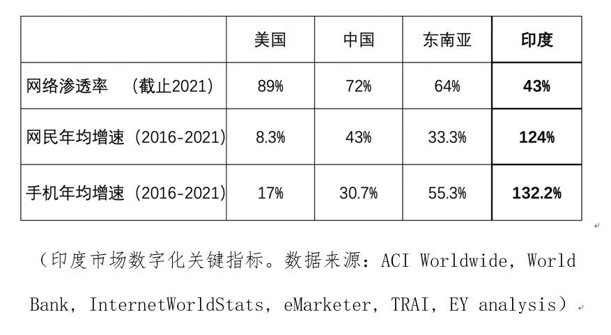 2021年印度“独角兽”的爆炸性增长,首先与市场土壤、政策环境息息相关。就市场土壤而言,2016-2021年,数据显示的印度网络用户、智能手机的年均增速分别为124%、132.2%,远高于美国、中国与东南亚,而印度的网络渗透率截止2021年仅43%。作为全球人口第二多的国家,印度民众不仅在积极触网,而且远未到顶。这是一个适宜印度“独角兽”生长的优良牧场。