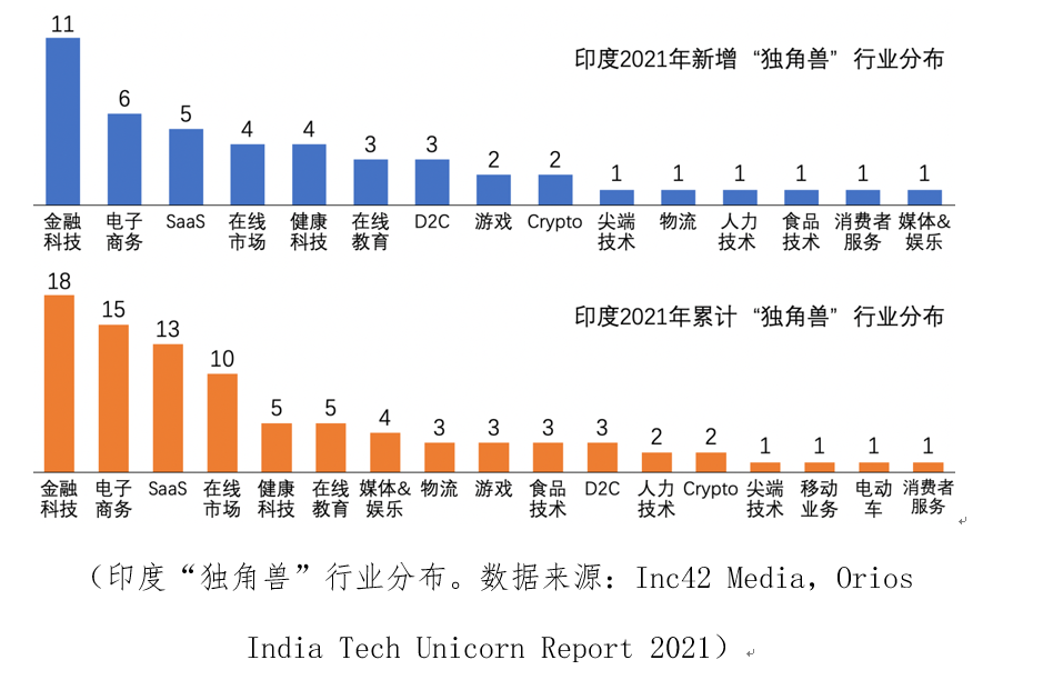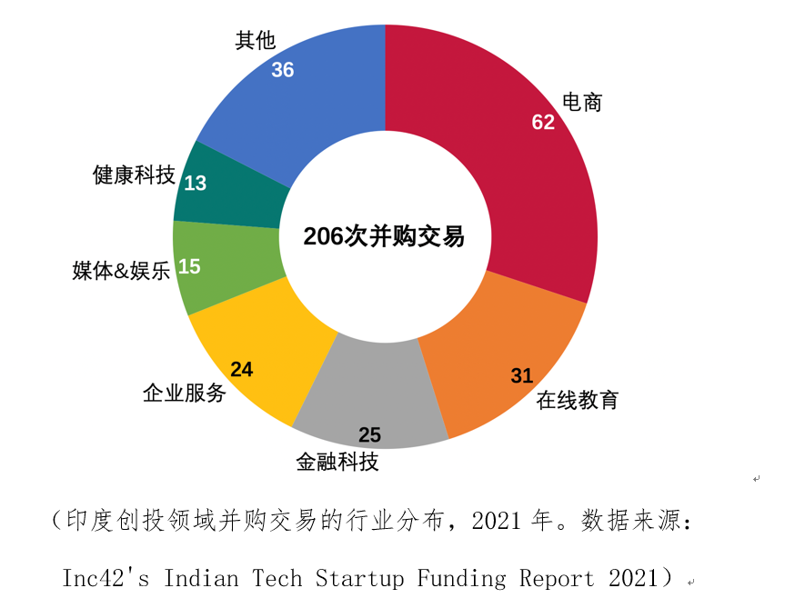 “独角兽”的融资能力远胜一般创业公司,还是在全球范围内吸纳最优质的资金。2021年,总部位于纽约的老虎环球基金领投了19轮的印度“独角兽”融资。其他印度“独角兽”的“饲养员”名单当中,包括红杉、纪源、软银、Accel等全球一线风投,以及亚马逊等全球知名CVC。在“募投管退”的投资流程中,投资固然重要,但退出以谋取投资回报同等重要。2021年,包括众多“独角兽”在内的11家科技公司成功IPO。相比之下,同期暴涨2.5倍的206次并购交易,象征了印度创投领域的退出交易繁荣,其中电商、在线教育、金融、企业服务、媒体&娱乐等互联网行业的并购退出活力四射,合计发生157次,占比76%。