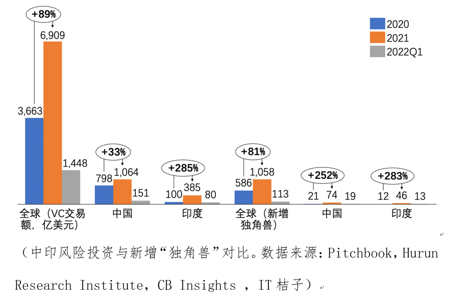 二、投资与并购浪潮,印度“独角兽”与美元资本共舞在市场土壤、政策环境准备就绪的同时,印度的英语语言优势、IT人才储备、企业家精神早已严阵以待。万事俱备之际,恰逢东风劲吹。全球资金的推波助澜,系印度 “独角兽”崛起最为直接的原因。尤其有趣的是,2021年正值印度创业低谷,当年新增创业公司1436家,相当于2015年高潮时的18%,但在美联储创纪录量化宽松的货币效应之下,全球风险投资交易金额当年同比增长1倍至6830亿美元,而印度的创业投资金额则同比增长3倍至424亿美元,创下历史最高纪录。