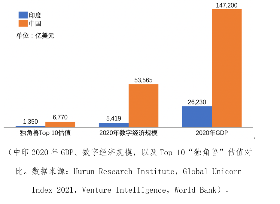 三、中美竞争之余,印度悄悄追了上来中国作为全球规模第二、亚洲规模第一的数字经济体,是否需要正视印度的“独角兽”现象?数据显示,中印之间2020年GDP产值相差5.6倍,中国数字经济规模是印度的9.9倍。2021年以来,中国“独角兽”Top 10估值合计6770亿美元,相当于印度的5倍。而字节跳动作为中国第一大独角兽估值3500亿美元,超过印度前99家“独角兽”的整体估值(3320亿美元,Inc42 Media 2022Q1数据)。