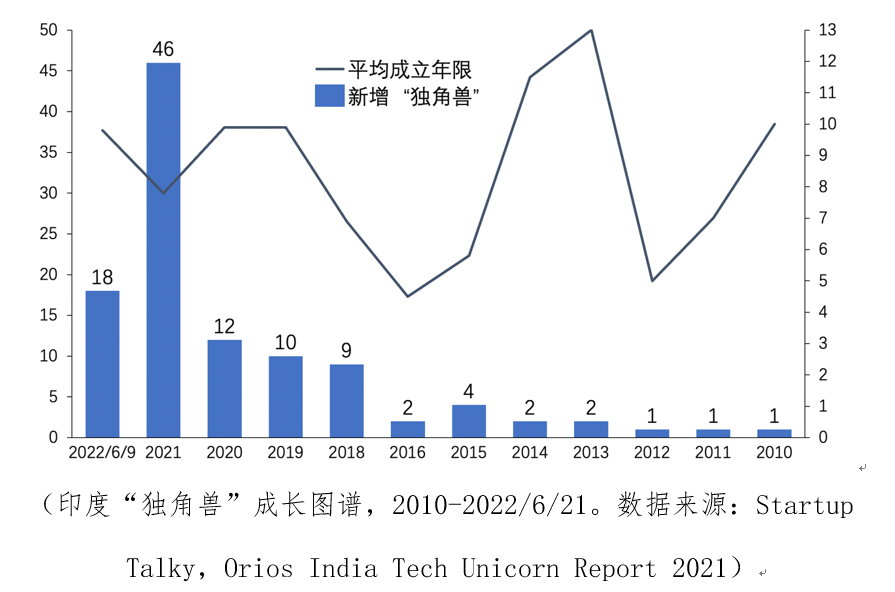 进入2022年,高通胀之下的美国经济徘徊在衰退边缘,引发科技股市值回撤以及美元资本的投资风格趋向保守,但作为全球资本洼地的印度,还在以每一到两周新增一家的速度催生“独角兽”。按照印度研究机构Inc42 Media的估计,还有55家印度“预备独角兽( Soonicorn)”等待转正。“独角兽”是明日之星,是一个国家创业生态与科技进步的象征。而在印度“独角兽”军团异军突起背后,机制性动力究竟是什么,这对中国来说又意味着什么?一、疫情加速数字化,印度“独角兽”的市场与政策土壤2021年堪称印度的“独角兽”之年,全年新增数量同比2020年增速为383%,相当于此前10年的总和。而且,“独角兽”成熟速度还在加快,2021年新增的“独角兽”平均成立年限为7.8年,相比此前两年缩短了2.1年。