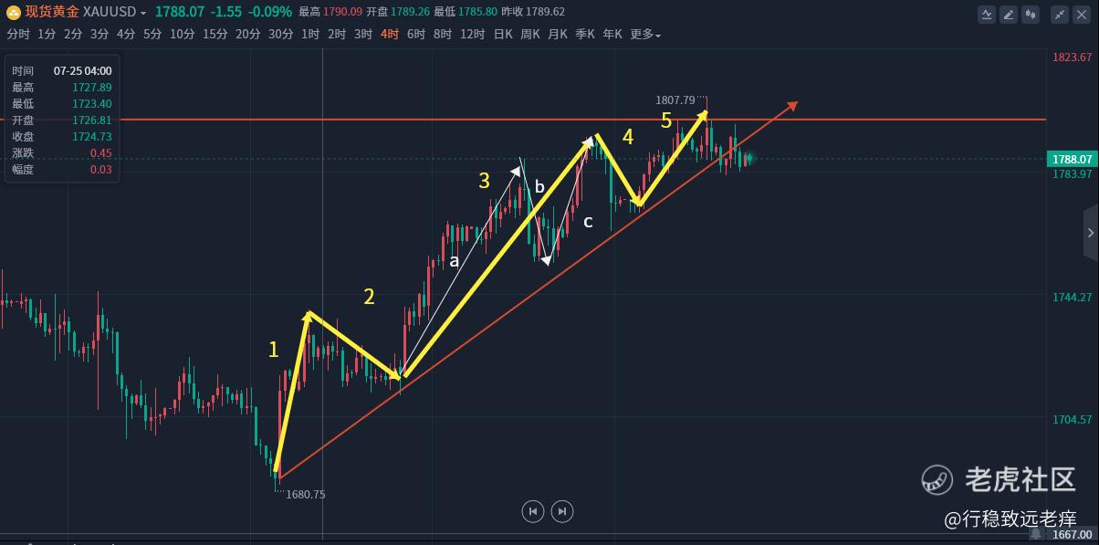 黄金已经从上升趋势,转为较为明显的震荡趋势,整体的上涨趋势线也是首次被跌破,而且在1800位置,是收出了3到4根触碰1800的上影K线。按照波浪理论,黄金这波反弹的上升5浪也算走得比较完整,而且在3浪还走出了一个小结构abc浪,可以说这波反弹结构已经很完整了。图上也很明显,形成了一个收口的上升三角形,后市看跌。