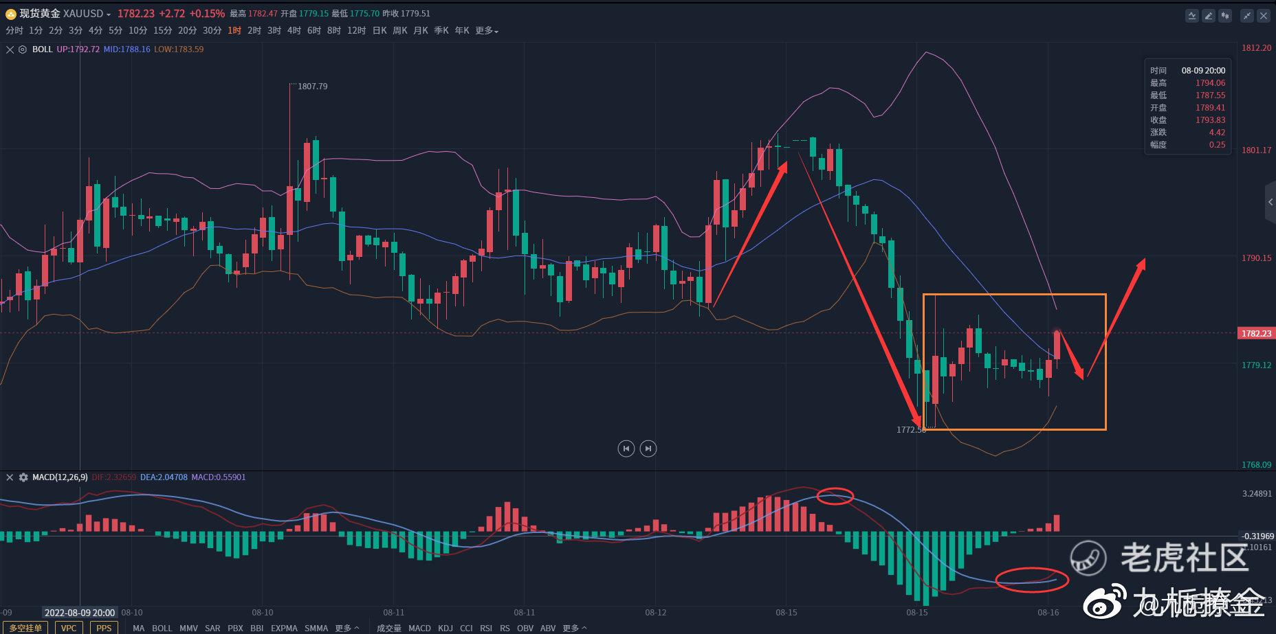 首先,看一小时图,现在看其实与昨天看的时候也并没有什么太大的变化,那时候是下跌,直播过现在是到1772之后不跌了,变震荡了,并且看昨天白天只有在早上8点的有一根阳线,其余的都是阴线,也是到昨天20点出现了阳线,不过当时是到了1772,之后也并没有出现反弹,而是走出了一个震荡,现在布林带也打算收口了,下边快慢线在昨天上午9点出现了死叉就回到零轴下,动能柱也是在出现死叉的时候随之变大,直到19点到零轴底部,之后就逐步缩小,快慢线又在今天早上5点——7点粘合这走了一段时间之后,就出现了金叉开始向上走,至于快慢线会不会回到零轴上,也还是有很长一段距离的。